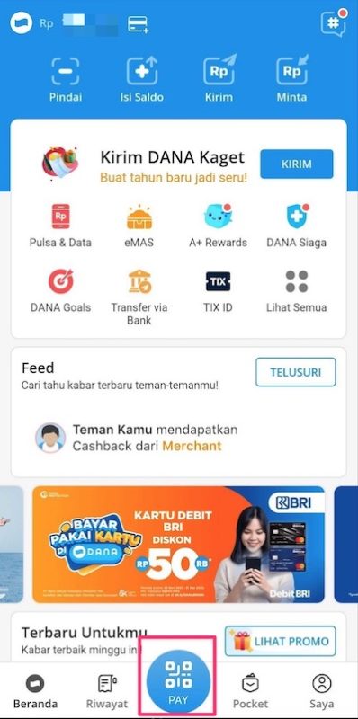 Untuk melakukan scan QR Code, silakan buka aplikasi DANA. Kemudian klik tombol Scan. Pastikan saldo DANA kamu cukup untuk melunasi tagihan yang harus dibayar.