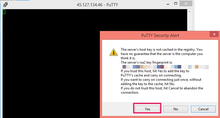2. Notifikasi Keamanan PuTTy. Biasanya ketika pertama kali Anda akan meremote virtual server, maka server akan melakukan sinkronisasi SSH RSA Key terlebih dahulu untuk keperluan security. Silahkan pilih โyesโ.