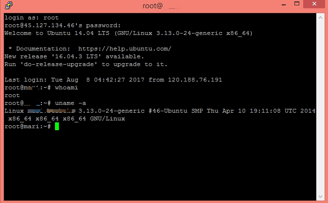 4. Remote Cloud VPS Berhasil. Tunggu sebentar maka Cloud VPS Anda telah berhasil diremote via SSH. Setelah VPS berhasil Anda remote, itu berarti Anda bebas melakukan apapun terhadap server.