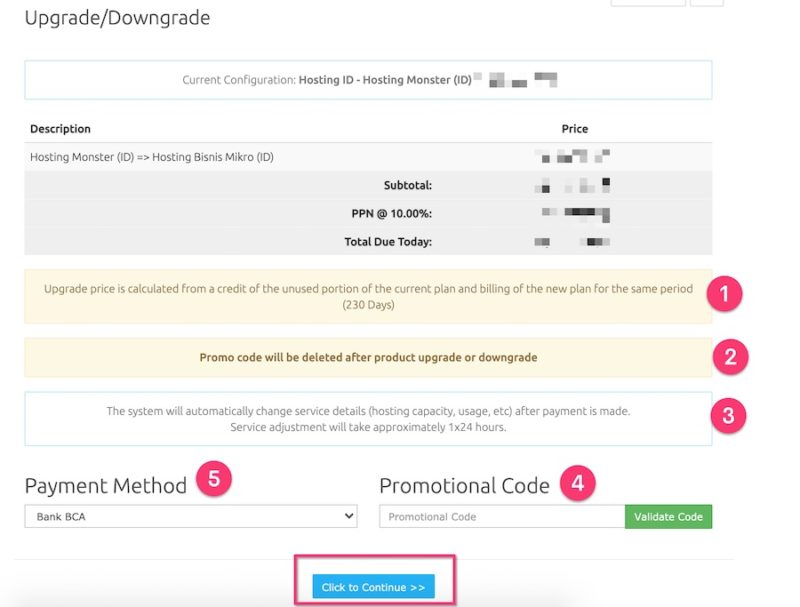 - Layanan hosting yang ingin diupgrade masih aktif (tidak suspend/expired) atau tagihan perpanjangan belum diterbitkan.