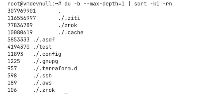 Pada contoh di atas menggunakan perintah du -b --max-depth=1 | sort -k1 -rn. Perintah yang dicontohkan merupakan perintah untuk melakukan sortir ukuran dari masing-masing file atau direktori dalam ukuran bytes dan maksimal kedalaman direktorinya hanya satu.