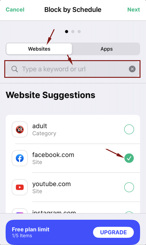 - Pilih โWebsitesโ untuk memilih atau menuliskan URL yang akan diblokir dalam waktu tertentu.ย ย
