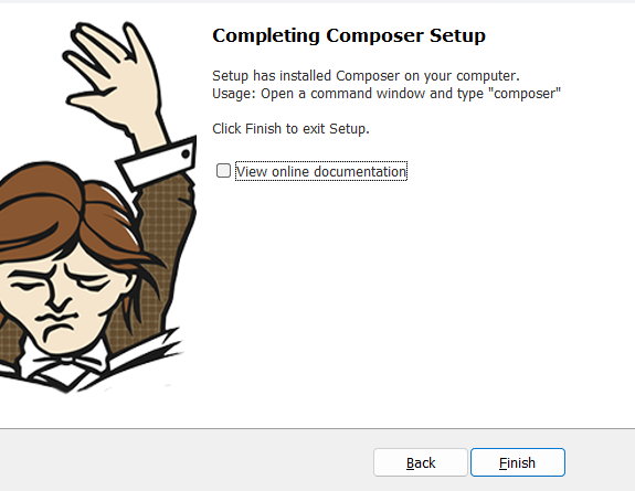 Instalasi composer selesai, silahkan bisa klik Finish.ย