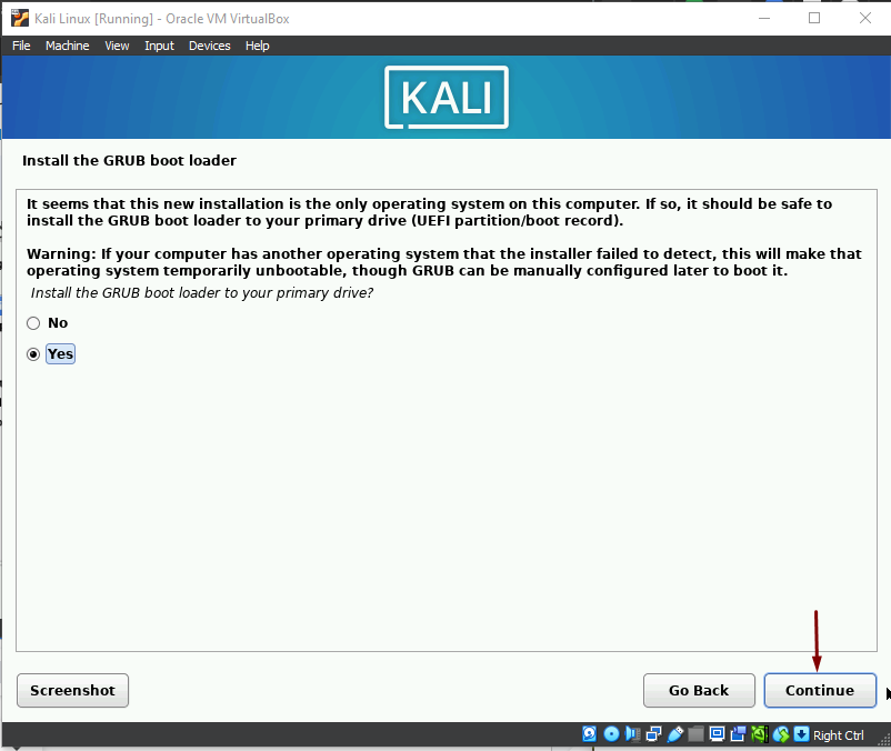 - Selanjutnya proses instalasiย GRUB boot loader untuk memudahkan booting sistem Kali Linux, silakan bisa pilih Yes dan Continue.ย