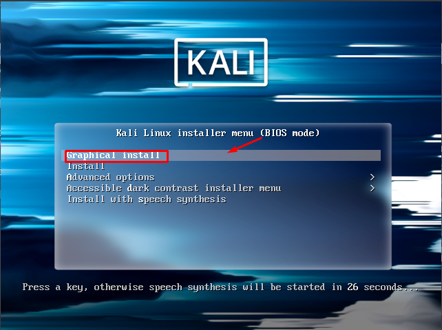 - Setelah itu, silakan menuju pada Kali Linux installer menu. Disini bisa dipilih Graphical install untuk memasang Kali Linux dengan tampilan GUI, seperti berikut: