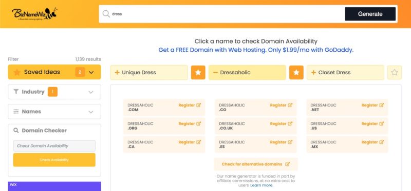 Selain menampilkan daftar nama, BizNameWiz juga mengidentifikasi nama domain mana yang tersedia.